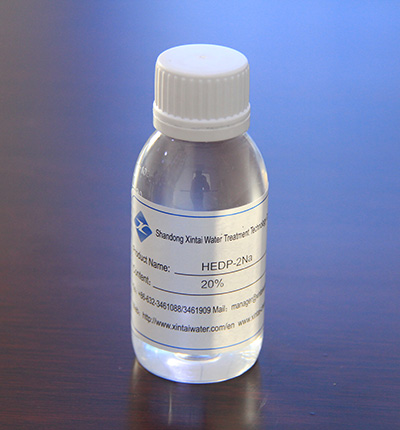 HEDP•Na2 is an organophosphonic acid corrosion inhibitor, it can chelate with Fe, Cu, and Zn ions, it can dissolve the oxidized materials, it has good scale and corrosion inhibition effects even under 250℃, it is stable under high pH value, not easy to be hydrolyzed, not easy to be decomposed under normal light and heat condition, its acid/alkaline and chloride oxidation tolerance are better than that of other organophosph-onic acids. HEDP•Na2 can form six-ring chelating compounds with metal ions in water system, Ca2+ in particular. HEDP•Na2 has good scale inhibition effects and obvious dissolution threshold effects. When used with other Water Treatment Chemicals, the synergistic effects is better.